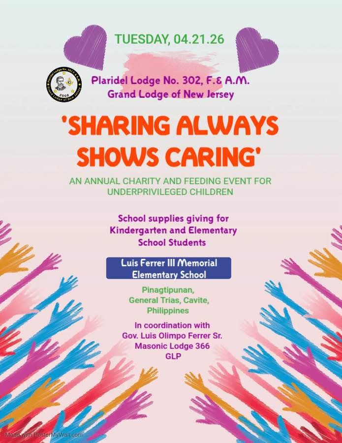 Plaridel Lodge No. 302, F.& A.M. Grand Lodge of New Jersey 'SHARING ALWAYS 'SHARING ALWAYS SHOWS CARING' AN ANNUAL CHARITY AND FEEDING EVENT FOR UNDERPRIVILEGED CHILDREN School supplies giving for Kindergarten and Elementary School Students Luis Ferrer Ill Memorial Elementary School Pinagtipunan, General Trias, Cavite, Philippines In coordination with Gov. Luis Olimpo Ferrer Sr. Masonic […]